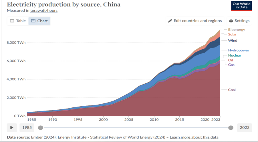- Looking at the electricity generation profile in the following chart, the very large role of coal becomes clear. Up until about 2015, as electricity demand rose steeply, that demand was primarily led by coal powered generation with a secondary role for hydropower. The role of other fossils, oil and gas was negligible which is markedly different to US, UK and other countries where gas power came in this period to play a significant role. It has been estimated in fact that over the period from 2000 to 2022 that China has added 900GW in new coal power capacity at an average of 40GW per year.