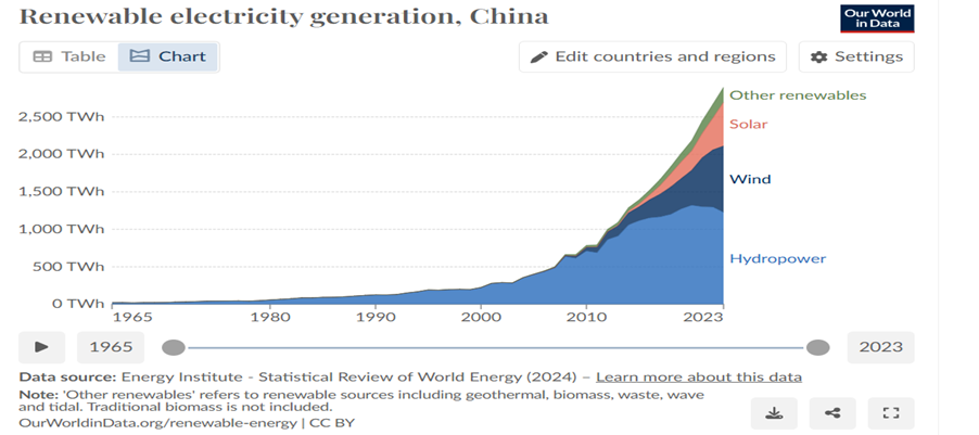 - What is not so obvious in the above chart is the enormous strides that China has also made over the past 15 years in development of renewable energy , albeit from a small base. This is better illustrated in the graph below and taking a few figures illustrates the point.