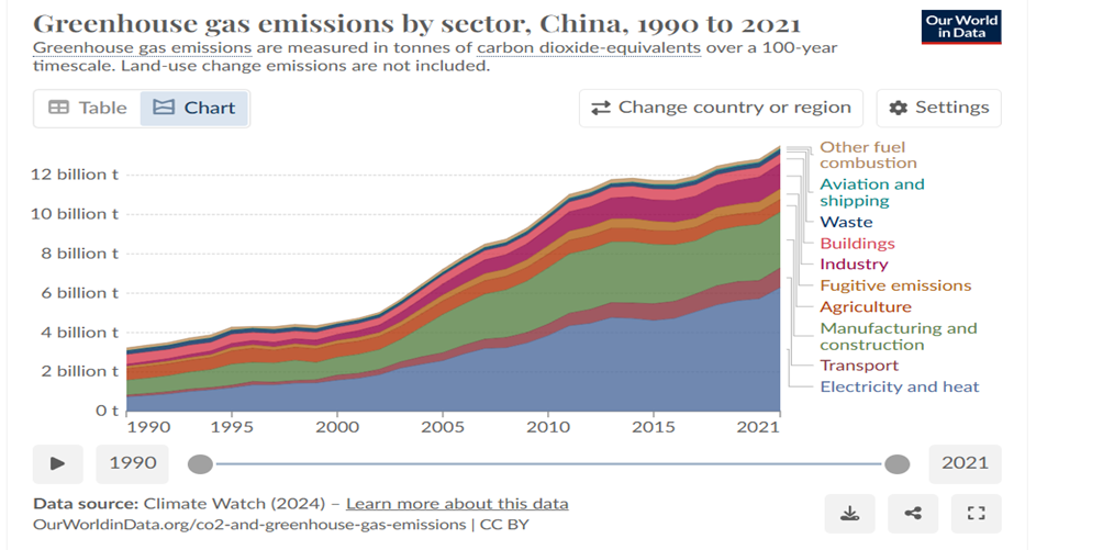 - The graph below indicate China’s GHG emissions growth overall and by sector from 1990. The first thing that strikes is the sustained growth in emissions from 2000, approximately when China started its modern industrialisation and development programmes, from a baseline of approximately 4 Gt CO2, almost trebling in ten years to 11 billion tonnes approximately by 2010. The rate of increase significantly levelled off from approximately 2012 before rising gain post Covid to its current levels of 15 billion tonnes per year.