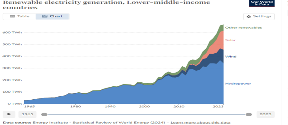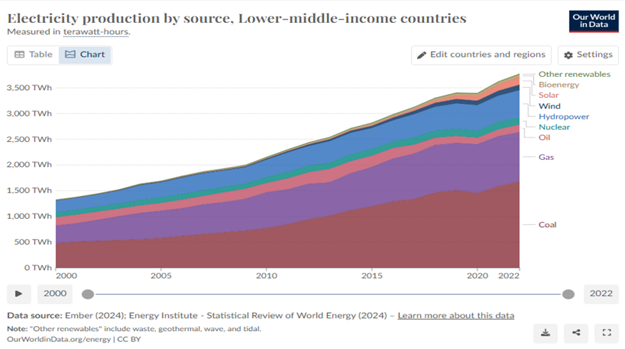 - Coal burning plants provide the largest share of electricity generation in lower-middle income countries in 2023 with 1,681 Terra Watt hours (TWh) in 2023 (43.8%) followed by gas power at 958TWh (25%) which is actually in excess of global average gas share of 22.5%. That relative share of gas has remained stable across the last decade. As the carbon emission intensity of gas is substantially lower than coal (200 vs 363kg CO2 per 1MWh), this relatively substantial share for gas power generation in lower-middle income countries is actually a positive indication of potential cleaner development pathways away from coal.