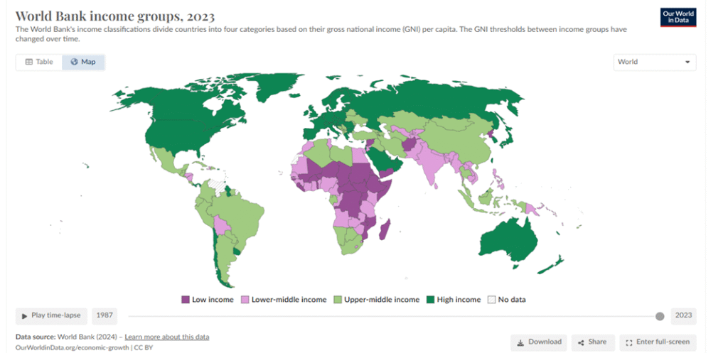 - The World Bank divides the countries of the world into different regions based on income and the following chart displays these regions from High Income though Higher-middle and Lower-middle Incomes to Low Income. The trajectory of energy development and carbon emissions in the middle and lower income countries will be a key factor in determining the global pathway in term of emissions and global warming, whether it is possible at a global level to become carbon neutral by 2050 (as required to stay within ‘safe’ warming levels) as these countries catch up with the higher income (‘developed’) world.