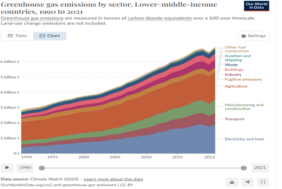 - The following graph indicates the growth of carbon emissions by sector in the Lower-Middle Income region overall. As can be seen from the graph, emissions in this region have increased broadly in line with the rest of the world over the past 20 years approximately reaching a total of 6.97 Giga (billion) tonnes CO2 equivalent for all greenhouse gases (GtCO2e) in 2021. This figure is almost double the amount in 2000 (3.75Gt) rising to 5.23Gt in 2010 but still less than half of the emissions of China (13.5Gt in 2021) or of the United States. However it is on a per capita basis, that the true disparity in emissions is most stark with the US emitting 17.75 tonnes per person average, China emitting 10.94 tonnes while lower middle income countries per person emissions are in the range of: Nigeria – 0.58 tonnes, India- 1.81 tonnes, Pakistan – 1.02 tonnes, , Egypt 2.38 tonnes; all several times less than developed countries or indeed China.