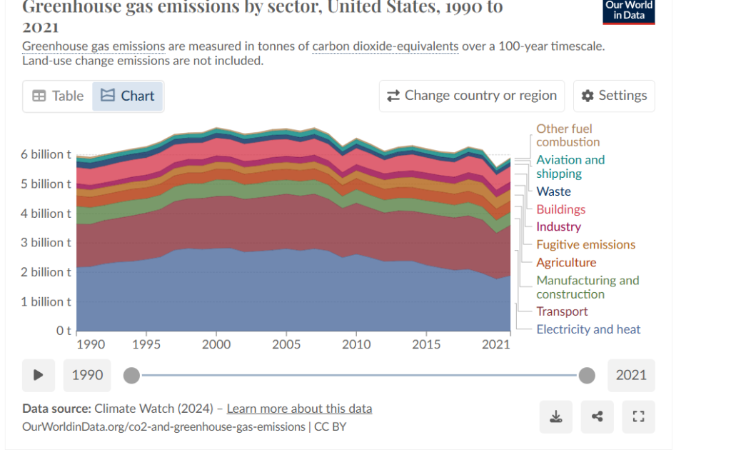 - The United States is the 2nd largest greenhouse gas emitter globally – pumping out 6 gigatonnes of CO2 equivalent (CO2e) in all green house gases in 2023 (WRI); representing approximately 11.25% of the global total (EU reports) .The gradual transition away from heavier carbon polluting sources of energy is indicated in the falling carbon intensity emissions per unit of energy; falling from 571g per kilowatt hour (kWh) in 2000 to 369g kWh in 2023.