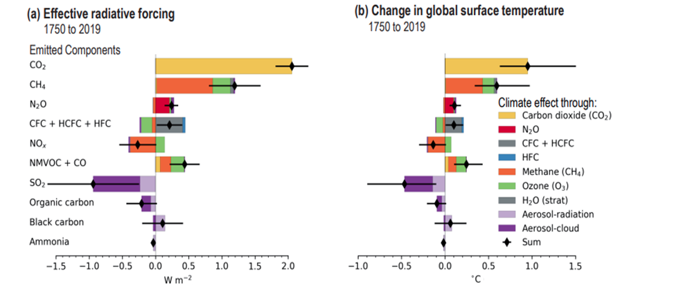 As can also be seen in the above IPCC diagram, the GHG impact of the accumulated CO2 in the atmosphere is the largest by a significant margin with a radiative forcing of 2 W/m2 and approximately 1C of warming to 2019 attributable to this GHG alone.