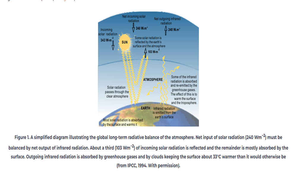 While the atmosphere does not entrap the air as a greenhouse does, the analogy does accurately explain how shortwave solar radiation (sunlight energy) penetrates the atmosphere which is then absorbed by the earth surface and emitted back out as long-wave infrared radiation energy. Approximately 30% of the sunlight is first reflected back to space by clouds aerosols in the atmosphere and other reflective before reaching the earth’s surface; 20% is absorbed in the atmosphere and 50% actually reaches the earth. Some of the energy reaching the earth surface is returned to space as long wave infrared radiation, some of which is trapped in the atmosphere thus maintaining an energy balance as well as helping to keep the earth warm as illustrated in the following diagram from thermopedia .