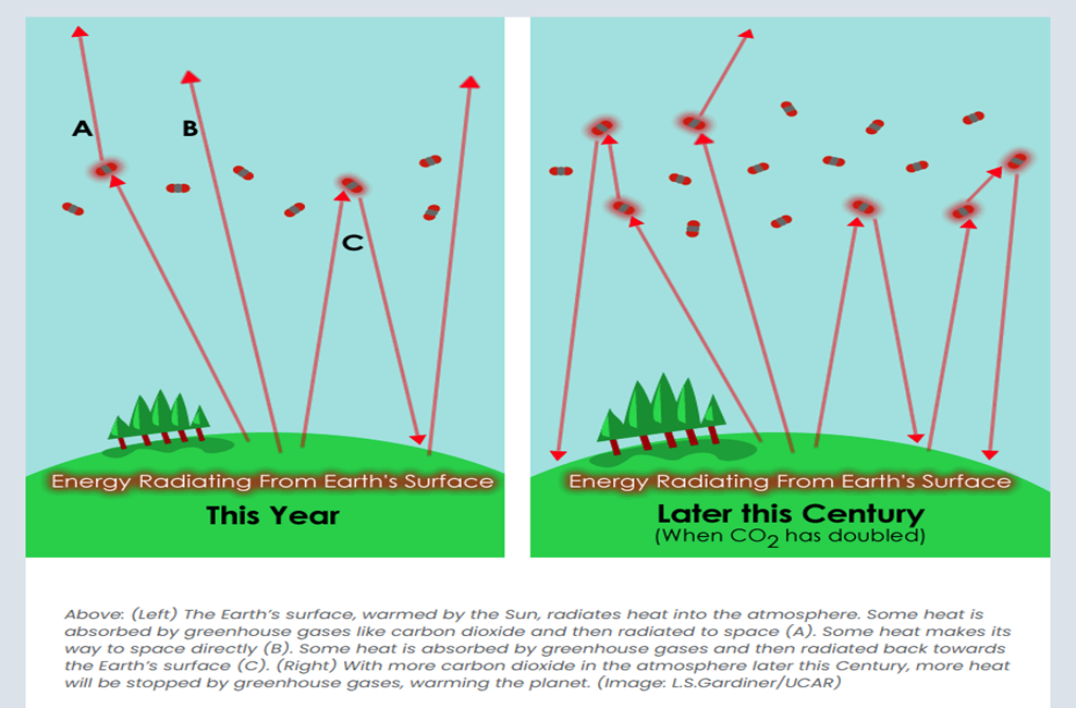 Most of the atmosphere is in fact made up of nitrogen (78%) ad oxygen (20%) neither of which gases absorb radiation. However as first identified by the Irish scientist, John Tyndall in the 1860s; other gases in the atmosphere such as CO2 and water vapour absorb the thermal radiation due to their more complex molecular structure which actually creates the earlier mentioned greenhouse effect. Tyndall found in his experimentation that coal gas (methane or CH4 in chemical formula) acted like a virtual sponge for infra-red light (heat).
