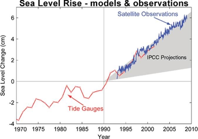 Fig. 1: Observed sea level rise since 1970 from tide gauge data (red) and satellite measurements (blue) compared to model projections for 1990-2010 from the IPCC Third Assessment Report (grey band). (Source: The Copenhagen Diagnosis, 2009)