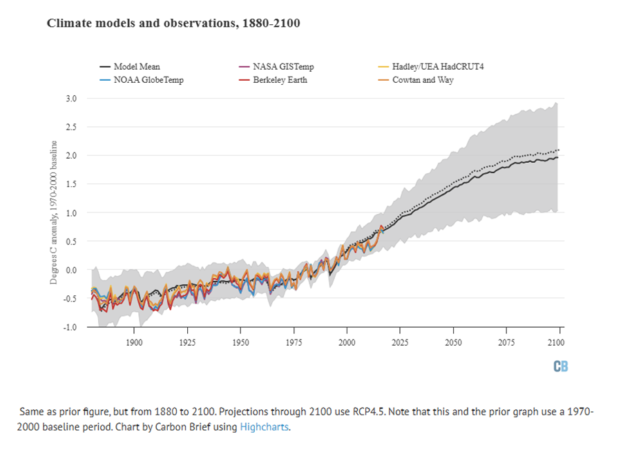 The longer period of model projections from 1880 through 2100 is shown in the figure below. It shows both the longer-term warming since the late 19th century and projections of future warming under a scenario of relatively rapid emissions reductions (called “RCP4.5”), with global temperatures reaching around 2.5C above pre-industrial levels by 2100 (and around 2C above the 1970-2000 baseline shown in the figure).