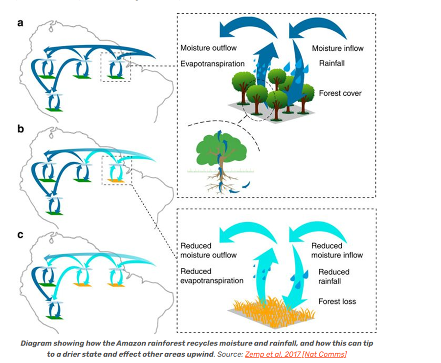 As the Carbon Brief Tipping Points explainer indicates: ‘ either reducing the amount of rainfall or the amount of forest can shift the [regional] climate into a drier state that cannot support a rainforest…. There is only so much drying that the Amazon could tolerate before the rainforest would no longer be able to support itself’