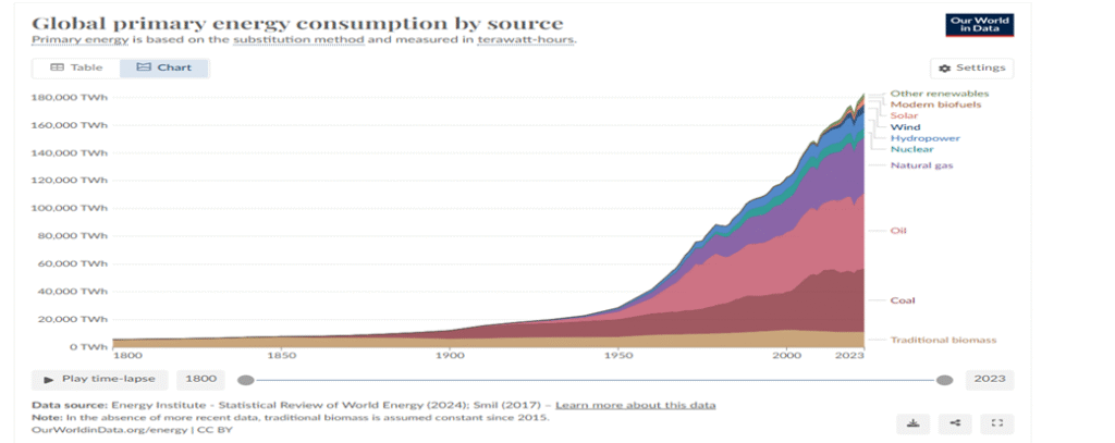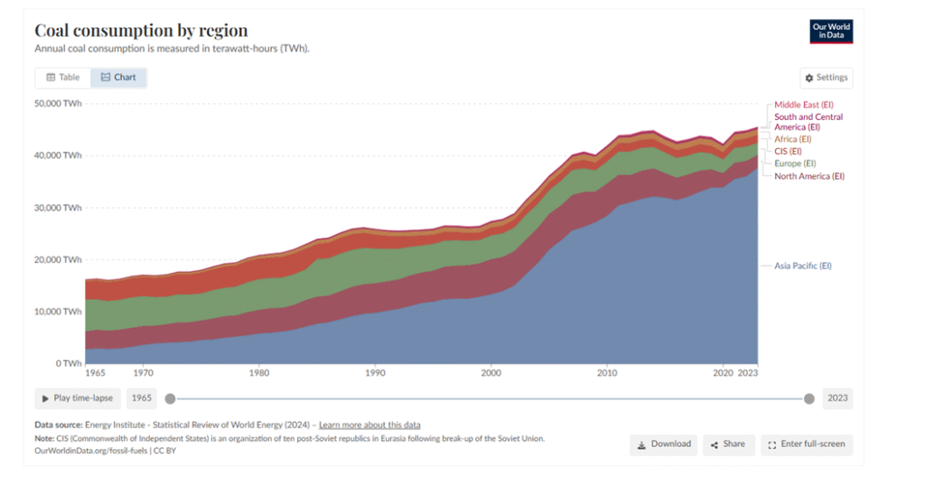 - Coal in 1950 provided more ½ of all energy consumption (12,600 TWh). By 2000, coal consumption had grown over three times to 27,400TWh but with the advance of other fossil sources mainly, coal’s share slipped to approximately 1/3 of total energy supplied. By 2023, share of coal of all energy had slipped back to 1/4 of total energy as renewables started to feature more prominently in the energy mix.