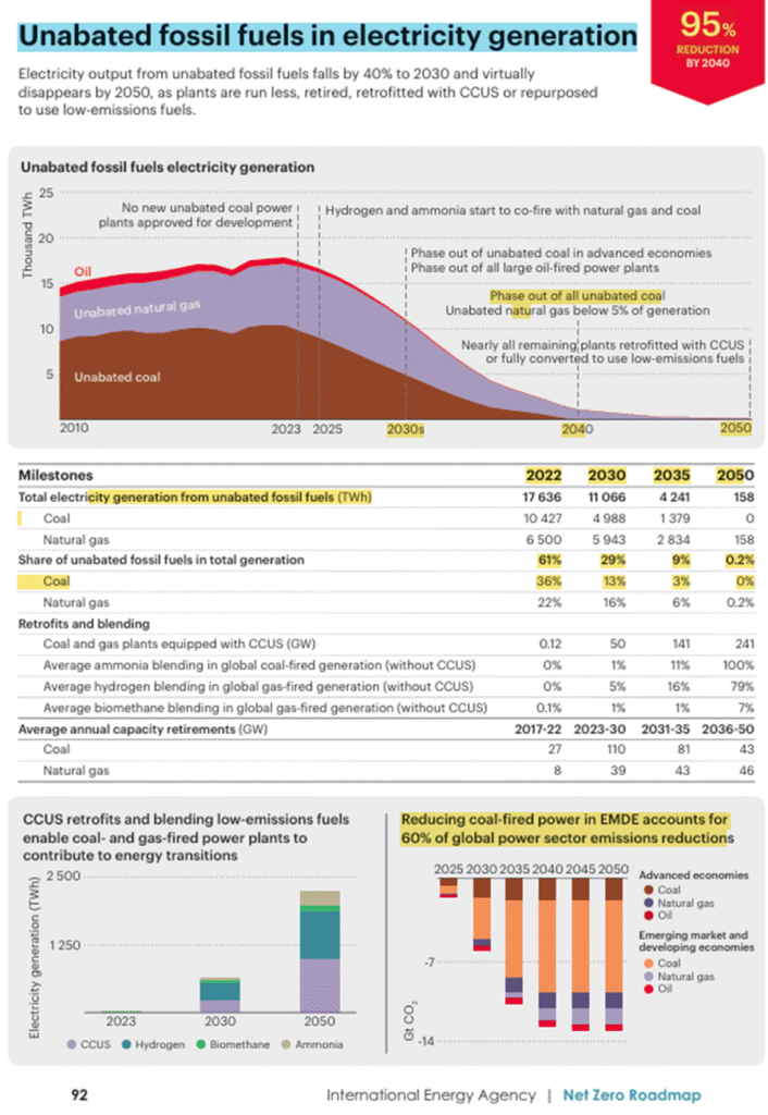 - The headline findings have rapidly gained widespread traction and are regularly quoted to compare current positions and progress. The report presents a number of key milestone diagrams which are at the core of the pathway design and the one above is one of the most vital related to fossil fuels. The stated near total elimination of fossil fuel emissions from electricity generation ( 95% reduction by 2040), combined with replacement by low emission electricity resources provides over 1/3 (34%) of the cumulative emission reductions required for Net Zero in 2050. The above table shows how this would be possible with particular focus for this Context Article on coal as highlighted in yellow.