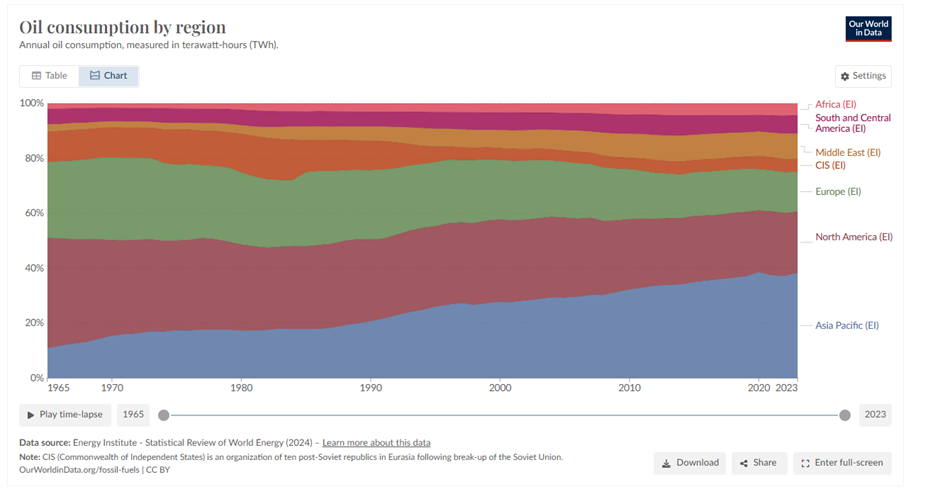 - Oil percentage share of total energy market has declined as its use is centred principally on transport although actual consumption has increased steadily, particularly in Asia with growing populations and car ownership rates.