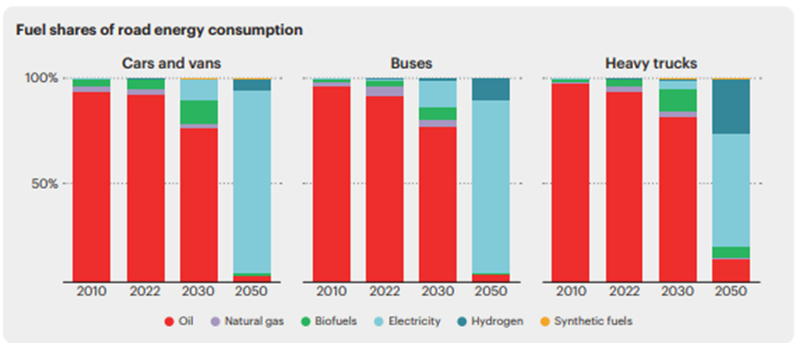 - As reflected in the following two graphs ( p93, p105); oil drops from 90% fuel in transport in 2022 to 80% in 2030 replaced by substantial amounts of biofuels and electricity and by 2050 represents only approximately 5% with electricity providing more than 90%.