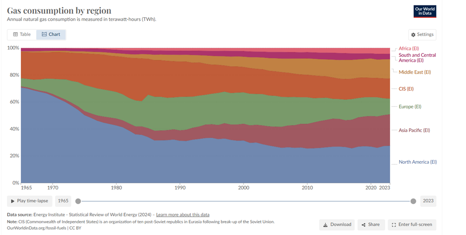 - As may be seen in the above graph showing share of natural gas consumption over time by region; up to the mid 1970s approximately, North America ,predominantly the United States, consumed more than 50% of the global total. By 2000 that had fallen to 31.4% as the Middle East developed to 7.6% and the Asia Pacific region to 12%. By 2023 that trend had reinforced with the Middle East increasing its global share to 14.43% and Asia Pacific to 23.23% of a much larger overall pie. While North America remains the largest market at 27.33%, Asia Pacific is now in second place and the share for Europe has almost halved from 23.28% in 2000 down to 11.55% in 2023 reflecting its significant power diversification towards renewables and energy efficiencies.
