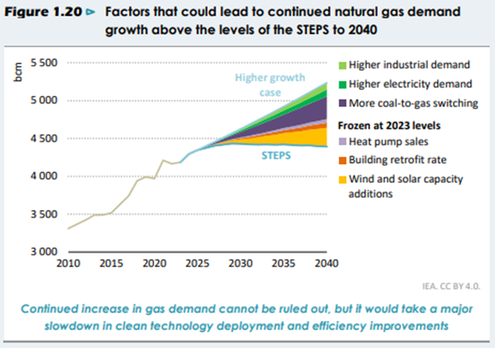 - Peaking Demand – From the above WEO2024 report, the IEA estimates that demand for natural gas will peak before 2030 even without the implementation of new policies (subject to the uncertainties considered). This change is attributable primarily to the roll out of new renewables and to a lesser extent energy efficiency measures. However NZ Report 2023 also makes clear that this rate of the transition would not be sufficient to achieve the 1.5C climate goal.