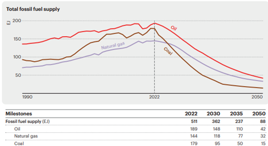 - Rapid Decline – As reflected in the following graph and table, in order to achieve the net zero emissions target Rapid Decline – As reflected in the following graph and table, in order to achieve the net zero emissions natural gas needs to begin to decline this decade, albeit not as steeply as coal or oil: in order to achieve feasibly net zero globally by 2050 (and thus the 1.5 degree heating goal): natural gas needs to fall from 144EJ ( = 40,000 TWh) to 118 by 2030 (32,778TWh), 77EJ (=21,388TWh) by 2035 and 32EJ by 2050 (8888TWh). That is a fall of nearly 50% current consumption in the next ten years and to halve that again in the following 15 years which by any account is an enormous transition to make.
